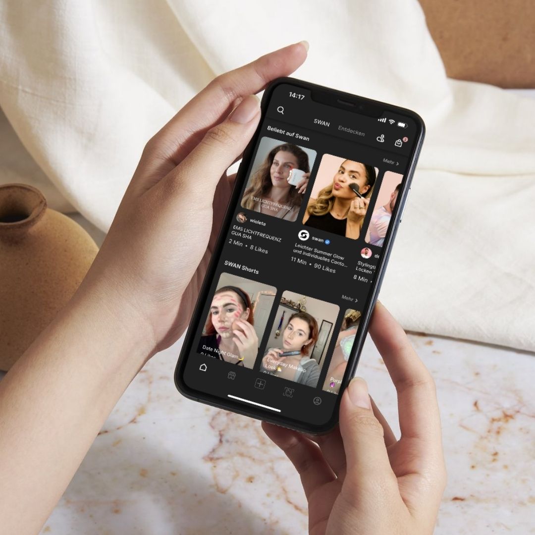 Schau dir Videos Schritt für Schritt an, shoppe Produkte direkt aus den Clips im SWAN Marketplace und teile deinen eigenen Content.
