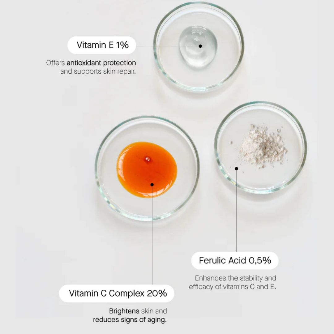 Die Formel wird durch Vitamin E und Ferulasäure ergänzt, eine preisgekrönte Kombination, die die antioxidative Wirkung des Serums verstärkt und Ihre Haut den ganzen Tag über schützt.